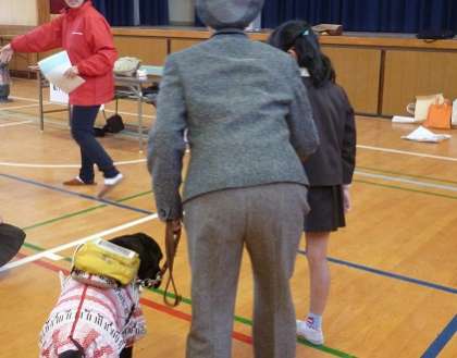 はじめに、講堂で視覚障がいのある方の日常生活のお話を聞きました。そして盲導犬のことについても教えていただきました。視覚障がいのある方に出会ったとき、自分たちにできることは何かを学ぶことができました。
