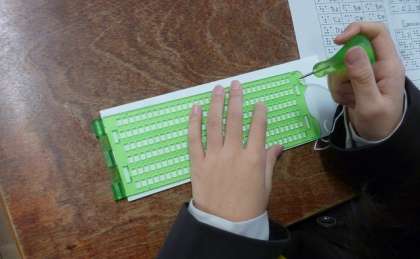 次に各学級で点字の仕組みや、書き方、読み方を教えていただいてから、実際に点字を書く体験をしました。自分の名前を点字で書き、嬉しそうに触って確認していました。
