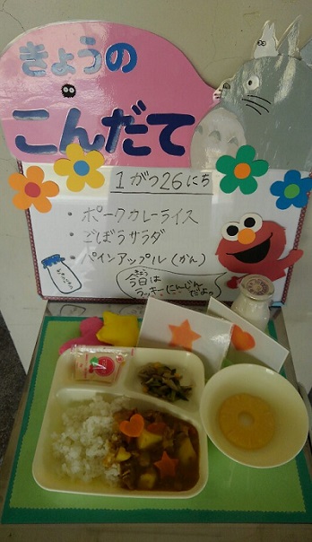 また、26日の給食では、給食調理員がカレーのにんじんを、星やお花の形に型抜きして、ラッキーにんじんとして全部のクラスに入れました。残食率は0%です。子ども達は楽しんで、おいしく食べていました。