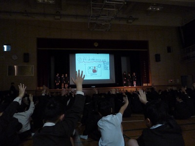 今週は給食強調週間です。毎日食べている給食がどのように出来上がるのか、給食調理員さんたちのインタビューを交えて給食委委員会の人たちが発表しました。また、日ごろの給食委員会の活動のようすもクイズ形式で楽しみながら知ることができました。