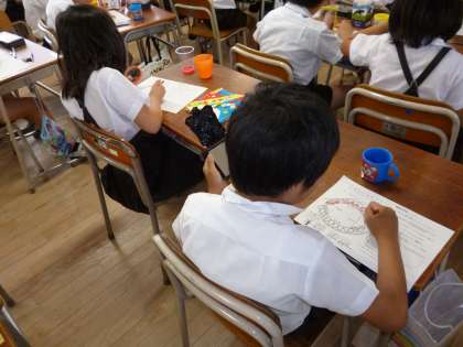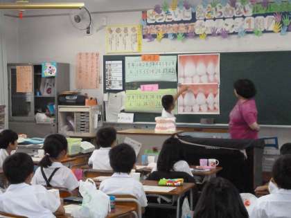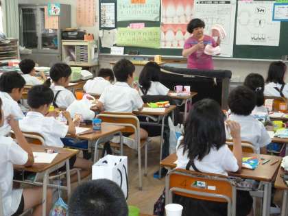 3年生が歯と口の健康について養護教諭の先生と学習をしました。歯周病について学び、自分の歯みがきが正しいか確認するために歯垢染色をしました。赤く染まった歯に驚いていました。きちんと歯垢をとる正しい磨き方をしなければならないことに気づきました。そして、えんぴつをもつように歯ブラシをもち、やさしくこまめに磨くよう教わり、歯みがき体験をしました。