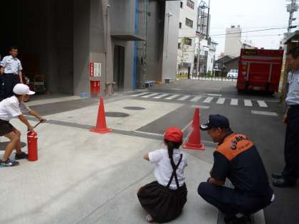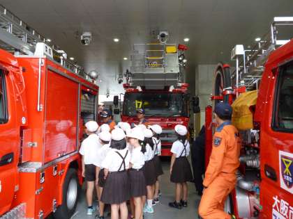 4年生が東成消防署に行き、防火体験をしました。地震体験車に乗り込み『震度6』を体験し地震のおそろしさを知りました。訓練用の消火器を使っての消火体験もでき、防災への関心が高まりました。消防署で働く人たちのようすやしくみも見学し貴重な体験学習となりました。