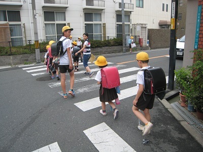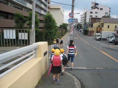 月に1回水曜日に地区別集団下校を行っています。緊急時に地区ごとに班で下校する練習や登下校時の歩き方の指導をします。高学年児童が班長になり低学年児童を見守りながら下校します。本校区は交通量の多い道路も通っていますので横断歩道のわたり方も気を付けています。