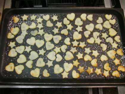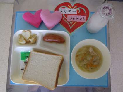 今日の給食は、食パン、ソフトマーガリン、フランクフルトのケチャップソース、スープ、焼きじゃが、牛乳です。今回は焼きじゃがで、ラッキーじゃがいもをしてみました。じゃがいもは半月切り、そしてハートと星の形にも切り、蒸し焼きにして、塩をふります。初の試みに、子ども達もドキドキわくわく。おいしく、楽しく、幸せを感じながら、今日もいただきました。