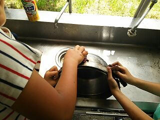 カレー作りの後片付け、お鍋をピカピカに磨いて、かまどの掃除もします。今日は雲が多いので、時々陰って作業もはかどります。夕方に雨が降ってくれないかな?