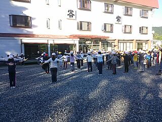 おはようございます!今日も快晴です。6時に起きて、お布団を片付けてから顔を洗って宿舎前に集合しました。6時半から全員元気に揃ってラジオ体操をしました。ぐっすり寝たのでみんな腹ペコです。朝御飯をしっかり食べましょう。食後はそれぞれの部屋をキレイにお掃除して荷物は大広間に移動です。昼前には、次に宿泊する別の学校の子どもたちがハチ高原に到着します。仲よくあいさつできるかな? 7:00