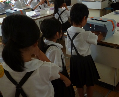「ていねいな手あらいをしよう」の学習をしました。まずはじめに水だけで手洗いをしたときの汚れを調べ、次に残っている汚れを石鹸を使って洗います。手洗いチェッカーという装置を使って、汚れを見て違いを見つけました。汚れた箇所をプリントに印をつけていました。「洗ったのにまだ汚れている。」といって何度か丁寧に洗い直しをしていました。丁寧に洗うことの大切さがわかった楽しい学習でした。