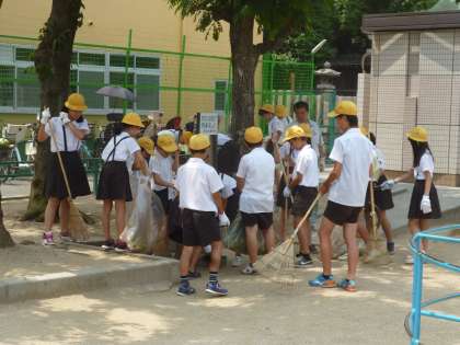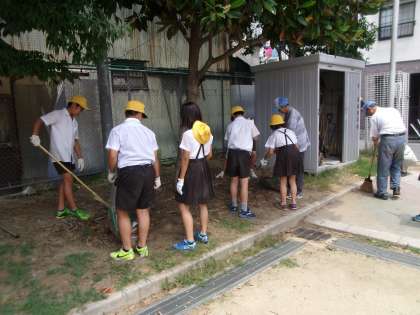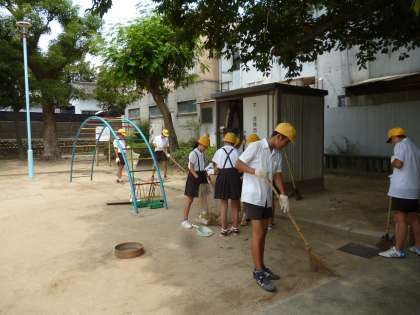 地域の人たちといっしょに近隣にある公園に出かけ、掃除をしました。暑い日差しの中でしたが、気持ちよく使えるようにいっしょうけんめいに清掃活動をしました。