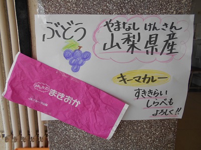 給食に秋が旬のぶどうが登場しました。山梨県産のものが届きました。ぶどうを包んでいる紙袋に「おあんなっせ」と書いてあり、調べてみると、山梨県の方言でした。「めしあがれ」という意味があり、子ども達に紹介して、みんなでおいしくいただきました。
