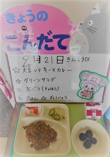 キーマカレーには、ひきわり大豆が入っています。好き嫌い調べもしてみると、おいしいし、サラダにも合うと好評でした。