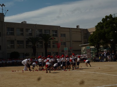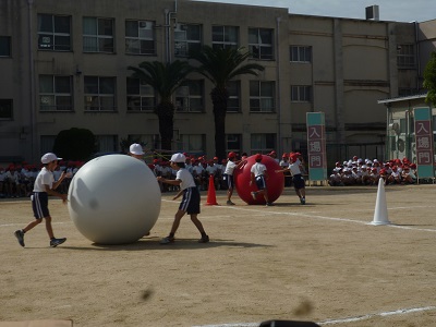 1年生の玉入れは、途中かわいいダンスを交えながらの競技でした。2年生は、大きな玉を3人で力を合わせてころがし、次へつないでいました。