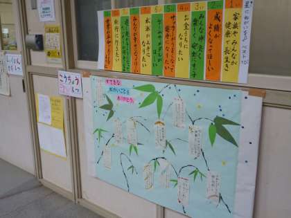 今週の校長先生の講話の中に、七夕にちなんで『子どもたちのねがい』を募集するお話がありました。たくさんのねがいが『校長先生ポスト』に入っていました。心あたたまることばやユニークなことばなどがあり、それを校長室前に掲示しました。