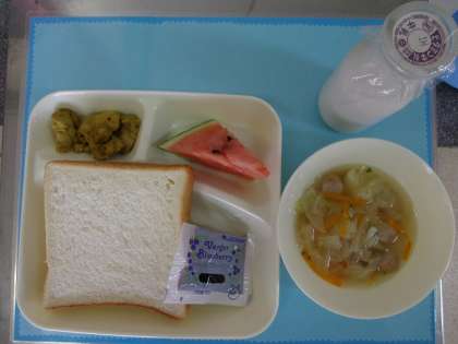 今日の給食は食パン、ブルーベリージャム、スパイシーチキン、ウインナーとじゃがいものスープ、すいか、牛乳です。