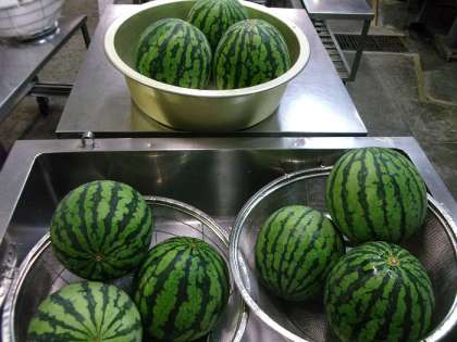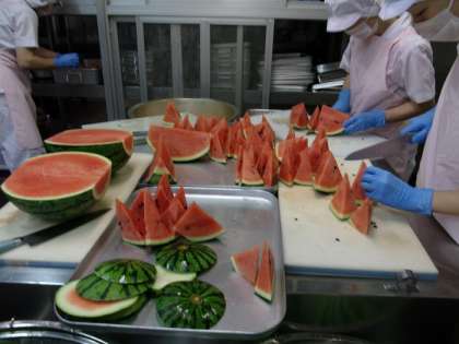すいかは、鳥取県産のLサイズが9玉届きました。それを、給食調理員が同じ大きさに、先が折れてしまわないように、気をつけて切っていきます。1人分は1/64玉です。