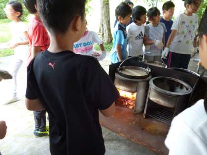 二日目の昼食「カレー作り」でした。じゃがいもやにんじん、玉ねぎをなれない手つきで切ったり大きな鍋をかきまわしたりして協力して作っていました。木切れやわりばしに火をおこすのに苦労していた班もありましたが、みんな作り終えることができました。