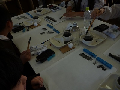 出前授業として水墨画教室を開いていただきました。習字の学習でしている筆遣いとちがい、筆の穂先だけ濃く墨をつけたり水加減を調節したりしてモノクロのグラデーションを作っていました。段ボールやスポンジの素材をいかして墨をつけて表現もしました。自分の感覚や発想、偶然性をいかした自由な表現で水墨画を楽しみました。