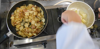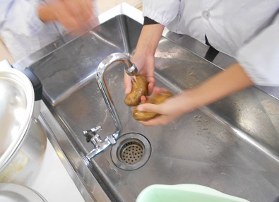 6年生が家庭科の授業で、じゃがいもを使った料理を調理実習しました。粉ふきいもとジャーマンポテトです。同じ食品でも、切り方や加熱、調理の仕方によって、いろいろな料理になることを学習しました。おいしく作ろうと、協力してがんばっていました。