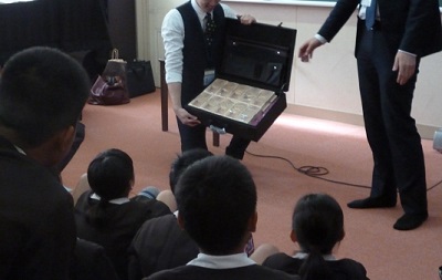 税務署の方が来校され、出前授業「税金に関する学習」をしていただきました。DVDを視聴しながら、税金の使われ方や必要性などを学習しました。最後、作られた1億円の札束(模擬)の入ったカバンを持ち上げてみて、重みを体験していました。