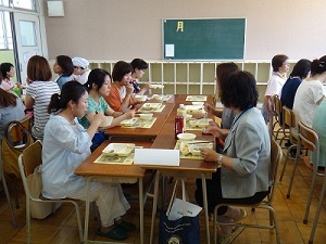 今年度東成区は7月28日(月)、大成小学校でありました。本校からも教職員やPTA役員の方々が参加しました。試食献立は、さけのマリネ、なめこのみそ汁、ツナ大豆そぼろ、りんごのクランブルです。新食品や新献立に「おいしい」「子ども達が喜んで、おかわりしそう」と好評でした。ご協力ありがとうございました。