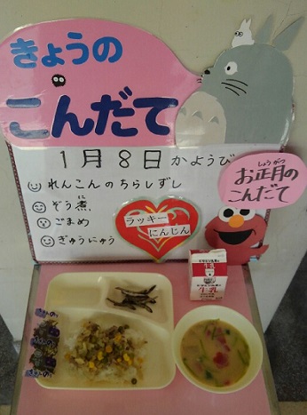 1月の給食は、おせち料理やぞう煮など、お正月の献立がたびたび登場します。「ぞう煮」は、白みそを多く使った関西風のものです。赤色の金時にんじんを、給食調理員がお花の形に型抜きして、ラッキーにんじんとして、全部のクラスに入れました。また、五穀豊穣を願って食べる「ごまめ」もカリッと香ばしく、子ども達に好評でした。