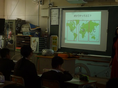 国際理解・多文化理解の観点から青年海外協力隊経験者の方をお迎えして出前授業をしていただきました。『ボツワナ』『マラウイ』などの国の衣食住のようすを中心に映像を使って分かりやすく学習を進めました。中でも、トウモロコシが主食で「羽アリ」を食べることがあるという話を聞き、自分たちの生活との違いに驚きをみせていました。また、紙類が貴重なもののひとつで高額なためノートを買うことが困難な状態だそうです。そのことを聞いた子どもたちは、今の豊かさを感じているようでした。最後に、世界にはいろんな文化や生活あり、それぞれの違いを認めることが大切であるとお話ししていただきました。