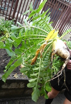 広島県尾道市因島のジャンボ大根フェスティバル実行委員会からもらったタネと、大阪市のなにわの伝統野菜の田辺大根のタネを、給食委員会の活動で栽培してみました。小さいタネから大きな大根に育ち、校長室や給食室の前に展示しました。1番大きく育ったものは、なんと約3kg。「ほんとにジャンボやなあ。」と大喜びの子ども達でした。