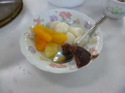 子どもたちは白玉粉に水を少しずつ混ぜながら一生懸命こね、丁寧に丸めていきました。トッピングにはあんこやフルーツ缶、きなこなどをかけておいしくいただきました。