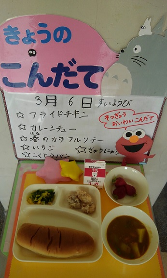 給食のなかで、6年生にもっとも人気があるからあげが、卒業お祝いこんだてに登場しました。あたたかいカレーシチューや、春を感じさせる菜の花とキャベツ、コーンのいためものやいちごも、子ども達にとても好評でした。