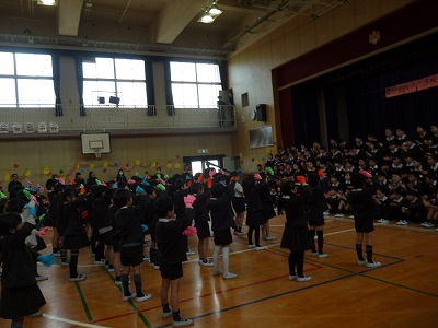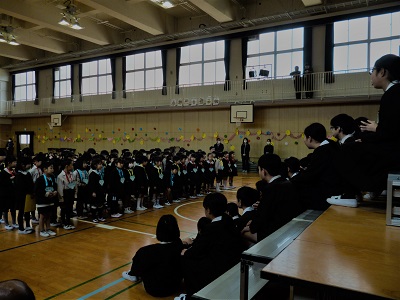 20日の卒業式を控え、今日は「6年生を送る会」の全校集会を行いました。5年生の合奏「威風堂々」の曲に合わせて入場した6年生。やや緊張した様子で始まりました。各学年からのお祝いの歌やダンスを観て緊張もほぐれてきたようでした。特に1年生の歌では、ぐっと胸に熱いものがこみあげてきて、涙ぐむ子たちもいました。