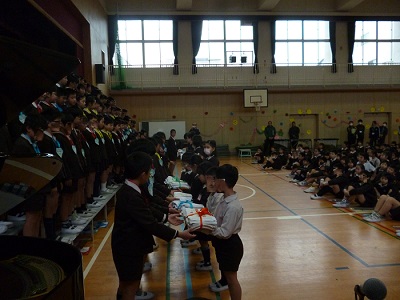 各学年から心のこもった歌・ダンス・言葉をいただき、次は6年生からのプレゼントでした。音楽の時間に学習した合奏「ラバーズコンチェルト」合唱「変わらないもの」を披露しました。迫力ある歌声・音色にみんな聞き惚れていました。そして、各クラスの代表者に雑巾をプレゼントしました。胸にメダル、脇にみんなからのメッセージカードを持ち、誇らしげに多くの拍手の中、退場しました。