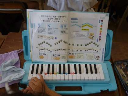 鍵盤ハーモニカを音の高さに気をつけながら演奏しています。