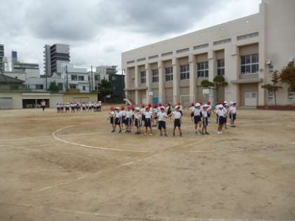 講堂や多目的室などで練習してきた演技を、運動場で確かめています。