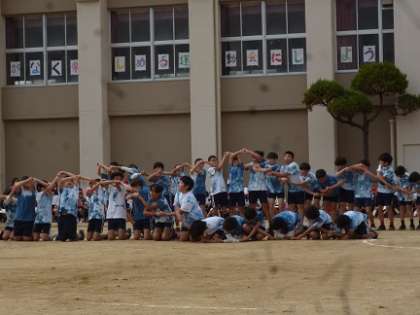 自然体験学習で作った藍染めTシャツを着て演技しました。