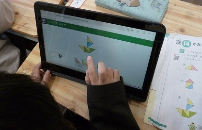 教科書QRコードをタブレットのカメラで読み込み、webの教材にアクセスすると、色板を移動させて形を作ることができました。