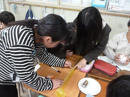 爪楊枝の容器、乾電池、紙皿について円周と直径を測っています。