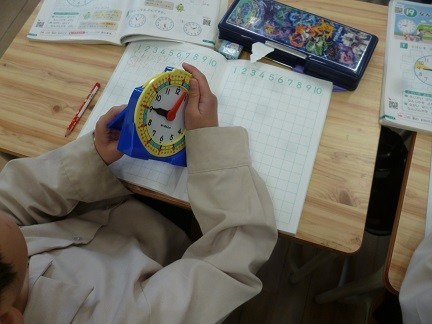 実際に時計の針を動かしながら確かめています。