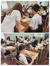 1組は理科 化学反応の実験 2組は技術家庭 防災スリッパの作成 1年後の自分を想...