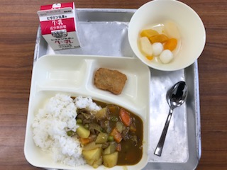 献立:カツカレーライス、フレーツ白玉、牛乳