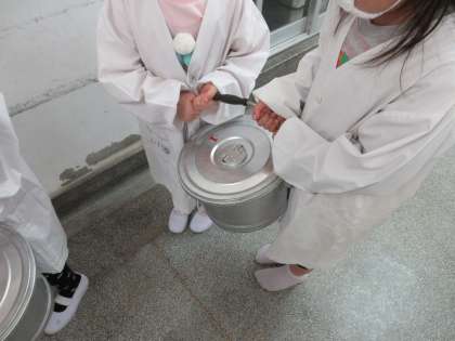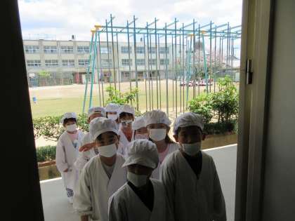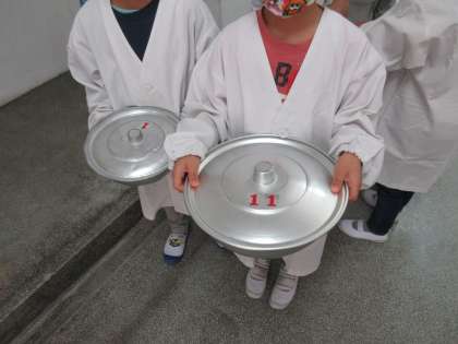 1年生は食器や牛乳は6年生に運んでもらっていますが、給食当番は大おかずやごはん小おかずを運んでいます。みんなで協力して運びます。