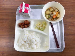 献立:まぐろのオーロラ煮、じゃがいもと野菜の含め煮、キャベツの梅風味、ごはん、牛乳