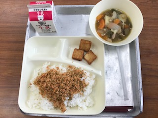 献立:鶏肉とじゃがいもの煮もの、あつあげのしょうゆだれかけ、紅ざけそぼろ、ごはん、牛乳
