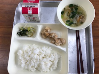 献立:鶏肉のからあげ、中華スープ、チンゲンサイともやしの甘酢あえ、ごはん、牛乳