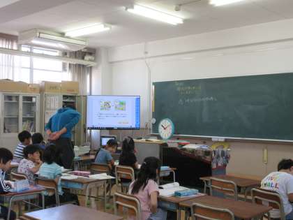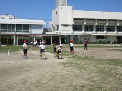今日はとても良いお天気で体育日和です。5年生はリレーのバトンパスの練習をしています。教室では3年生が算数の時刻の学習をしています。