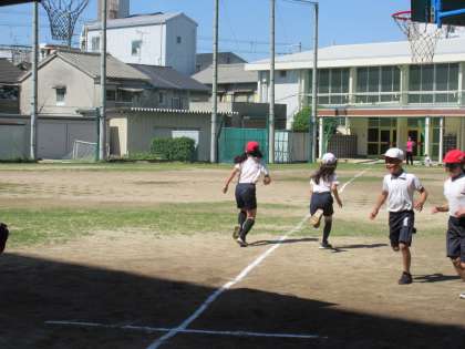 とても良いお天気の中、4年生は50m走の練習をしていました。力いっぱい走ってとても気持ちよさそうでした。