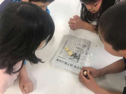 5年生は、じゃがいもを使って、ヨウ素液の実験をしています。