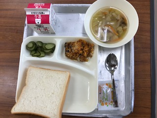 献立:じゃがいものミートグラタン、スープ、きゅうりのピクルス、パン、アプリコットジャム、牛乳