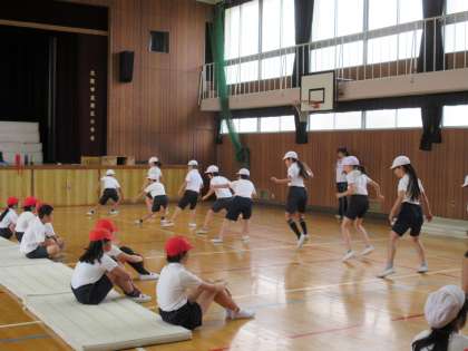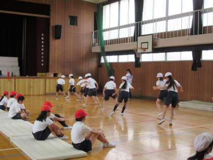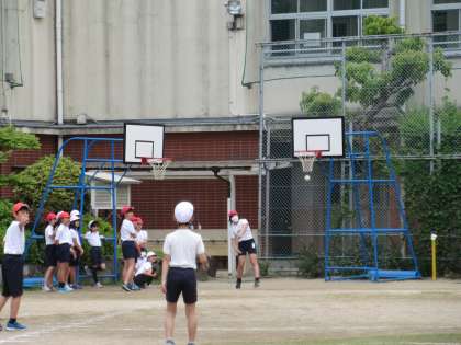 5年生は反復横跳びとソフトボール投げを測定しています。
