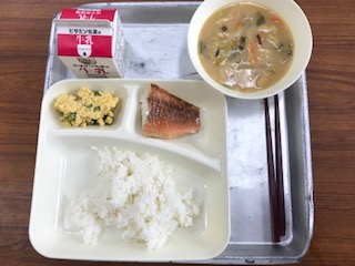献立:あかうおのしょうゆだれかけ、みそ汁、えんどうの卵とじ、ごはん、牛乳
