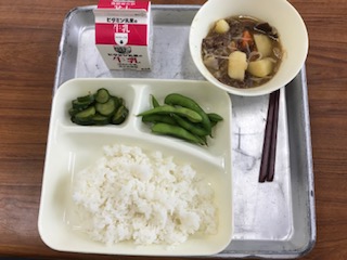 献立:肉じゃが、きゅうりのかつお梅風味、えだまめ、ごはん、牛乳