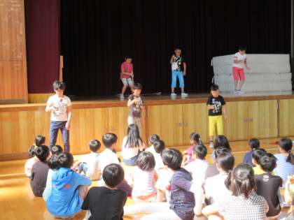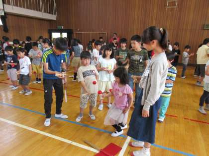 今日はけん玉集会の日でした。縦割り班でみんなで教えあいながら大皿の技に挑戦していました。